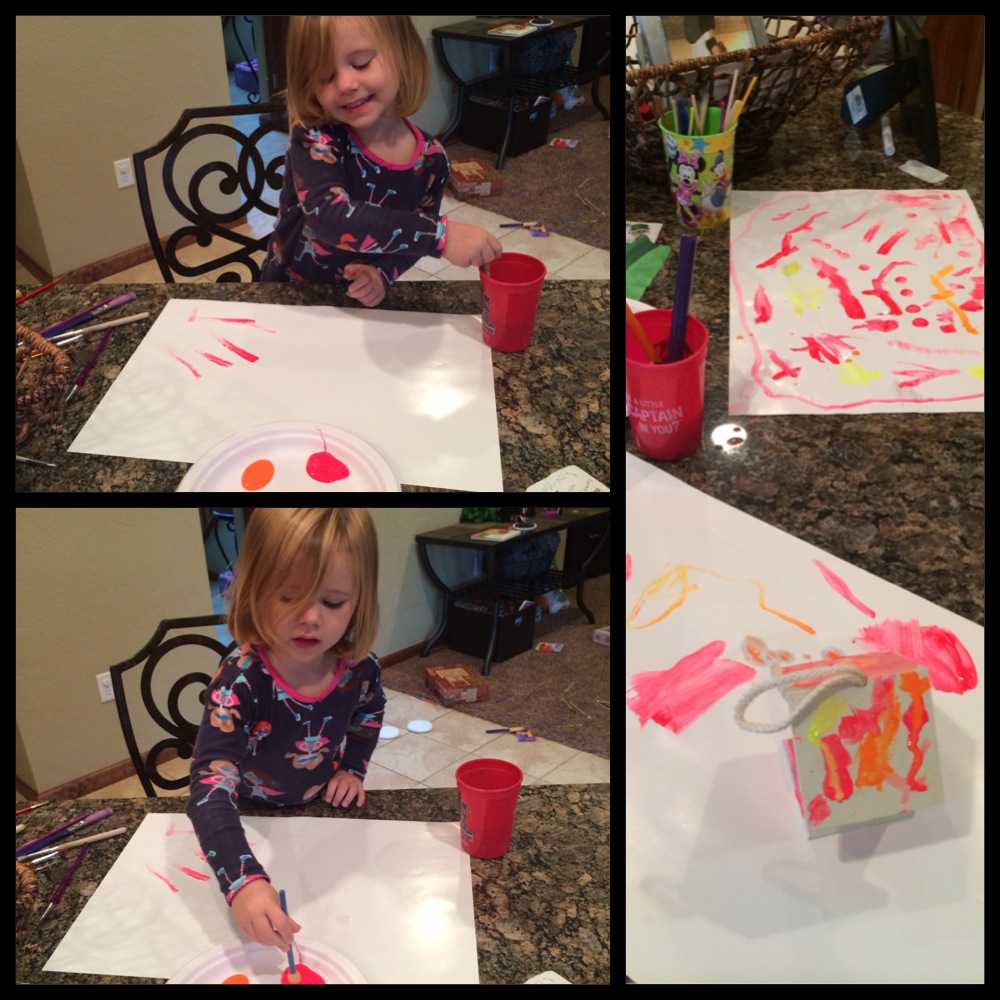We went on with our usual morning routine and when I offered out the paint brushes both kids were beyond excited!!! Aubrie was perfectly content for a solid 45 minutes only needing more brushes, a birdhouse and more paper to keep her satisfied! I’m not going to say it lasted quite as long as I had hoped for Colt but I got a good 15 minutes and well…15 mintutes of both kiddos content and contained meant I was able to unload the diswasher, switch over the laundry and even grab a quick call with one of my coaches – Pinterest craft = success!