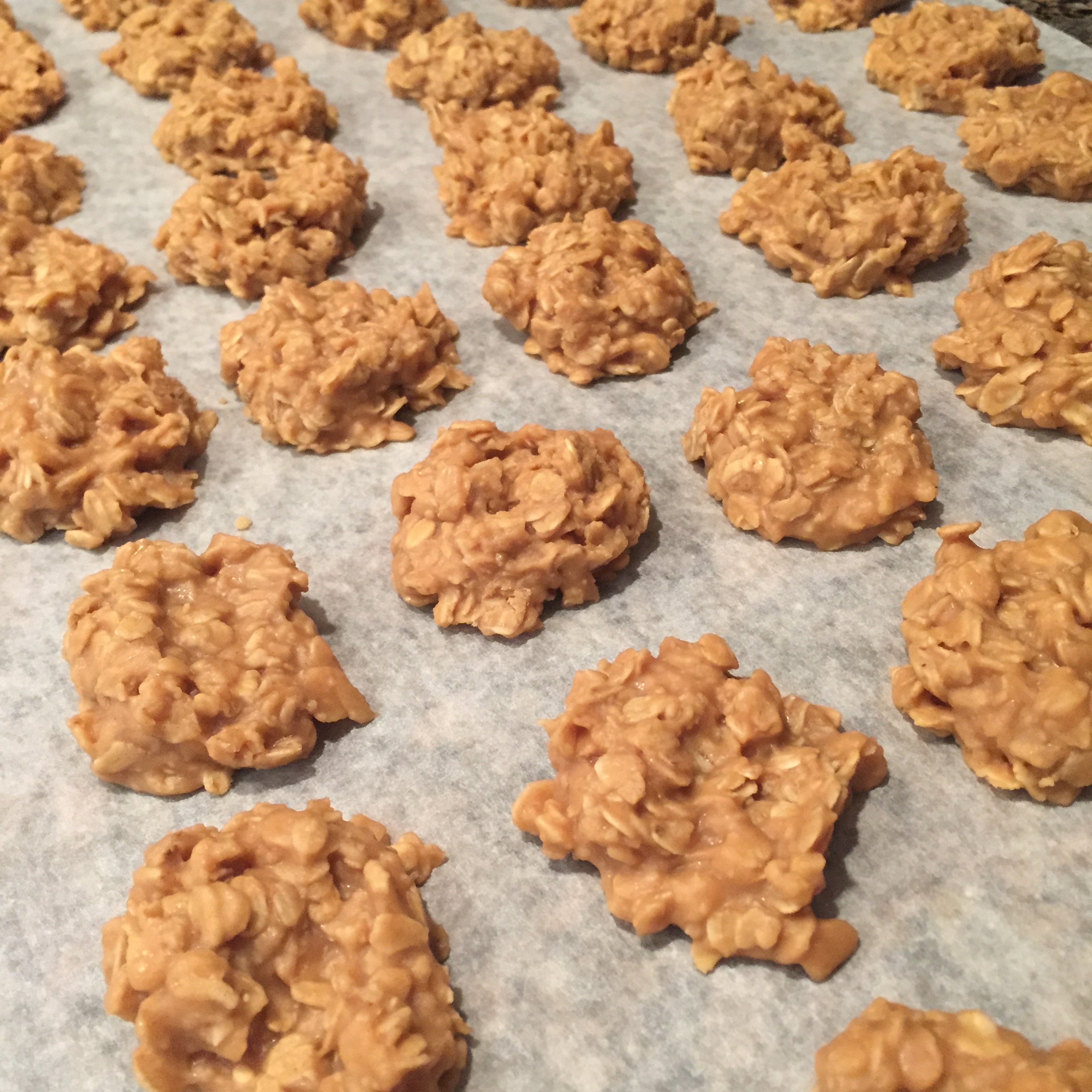 • Add oats and quickly drop onto waxed paper. I have found a pampered chef cookie scooper is the fastest and easiest way to do this but a spoon will also work!